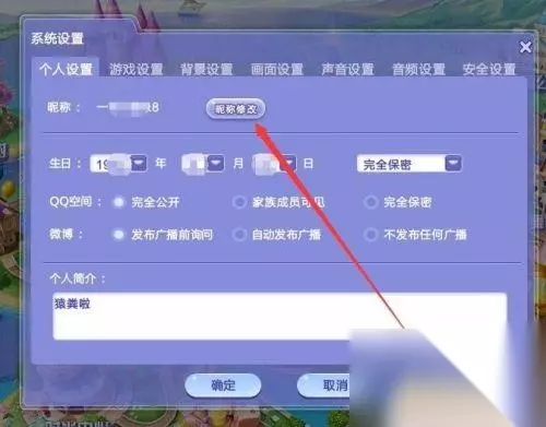 6.在”个人设置“选项卡中点击“昵称修改”,然后输入QQ炫舞名称再点击确定即可(QQ炫舞名称不允许与其他用户名称一致。所以在更改名称时可能会遇到“该昵称已被其他玩家使用”,在更改名称时可能需要尝试很多次)。