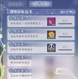 二、松月樱林成就1.初次通关2.拾取所有秘宝通关3.击败所有怪物通关4.移动35格内通关5.完成所有成就