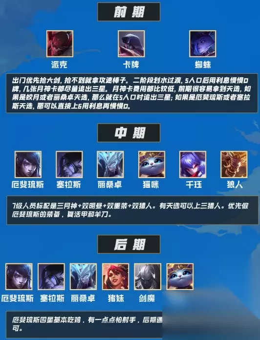 阵容分析: 这个阵容有点偏赌,四星厄斐琉斯决定了这一把能不能吃鸡(月神有三个、三星厄斐琉斯带满装备即可四星)。有一点点怕射手,需要针对一下金克斯。 阵容站位: