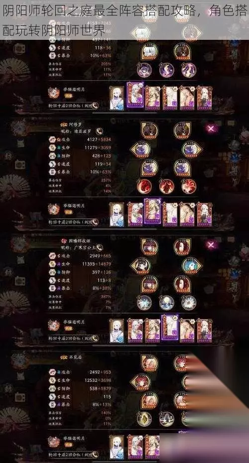 1. 源博雅:作为输出型角色,源博雅拥有强大的单体和群体攻击能力,是阵容中的主要输出点。 2. 百比丘尼:拥有强大的辅助能力,可以提升队伍的整体属性,是阵容中不可或缺的角色。 3. 姑获鸟:作为具有爆发性输出的式神,姑获鸟能够在关键时刻扭转战局。 阵容搭配策略 在确定了核心角色后,我们需要根据角色的特点进行阵容搭配。以下是几个推荐阵容: 1. 攻守兼备型阵容:源博雅+百比丘尼+姑获鸟+椒图+白狼。这个阵容以源博雅和姑获鸟为主要输出点,百比丘尼提供辅助效果,椒图连接敌人,分散伤害,白狼则提供额外的单体输出和辅助控制。 2. 群体攻击型阵容:源博雅+姑获鸟+青坊主+桃花妖+任意辅助角色。这个阵容以源博雅和姑获鸟的群体攻击为主,青坊主提供额外的输出和控制能力,桃花妖负责回复和增益效果。 3. 控制型阵容:以食梦貘青坊主等控制型角色为主,搭配输出型角色如姑获鸟或大天狗等,再加上回复和辅助角色如桃花妖或百比丘尼等。通过控制敌人来掌握战斗节奏,达到胜利的目的。 角色搭配技巧 在角色搭配过程中,需要注意以下几点技巧: 1. 根据敌人的属性选择合适的角色搭配。例如,面对高防御的敌人时,可以选择携带破防属性的角色;面对高输出的敌人时,可以选择携带具有护盾或减伤技能的角色。 2. 合理分配资源,提升角色的能力值。通过培养升级佩戴御魂等方式提升角色的能力,使其在阵容中发挥更大的作用。 3. 注意阵容的协调性。在搭配阵容时,要确保各个角间能够相互配合,形成协同效应,提高整个阵容的战斗力。 4. 根据战斗情况灵活调整阵容。在不同的战斗场景中,需要根据实际情况调整阵容的搭配和战术,以达到最佳效果。 通过以上介绍,相信大家对阴阳师轮回之庭的阵容搭配及角色搭配已经有了初步的了解。在实际游戏中,还需要不断摸索和实践,发掘更多适合自身的阵容和战术。希望本篇攻略能够帮助大家更好地玩转阴阳师世界,祝大家游戏愉快! (注:以上内容仅供参考,游戏阵容和战术需根据实际情况进行调整。)