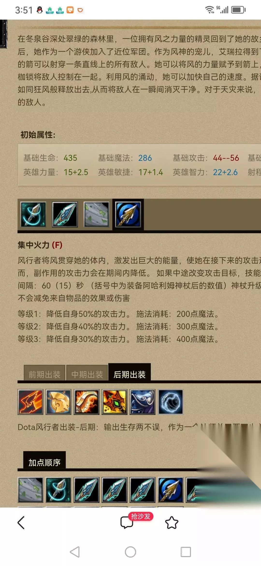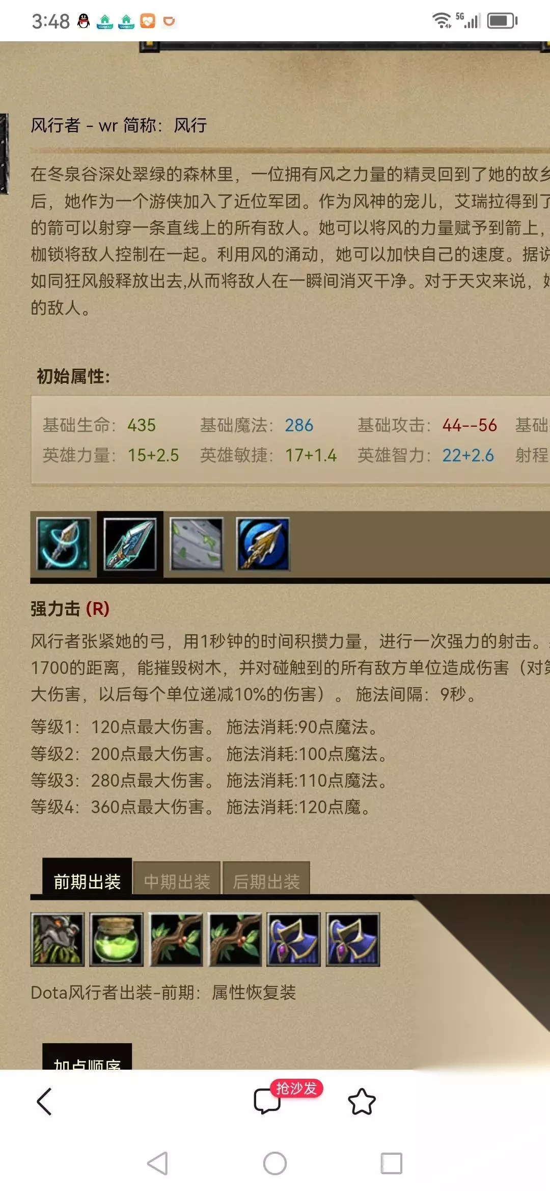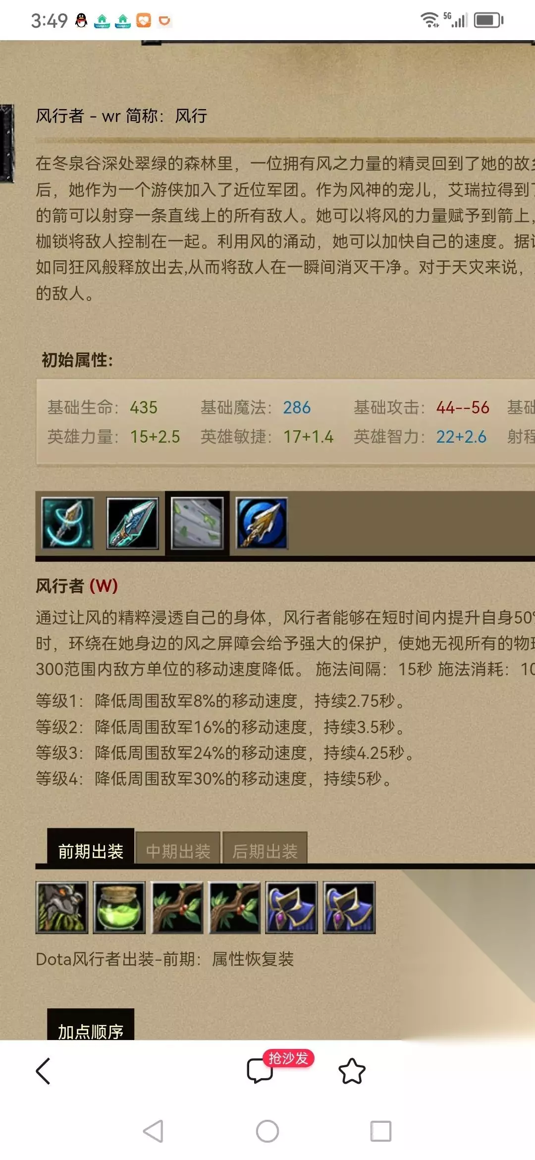 先说下出装,一般前期假腿,魔瓶。中期对剑,水晶剑,漩涡,晕锤。后期大电锤,大炮,深渊之刃,黯灭。如果线上压力大,就出隐刀,刃甲。或者,最近发明了一个不错的出装是隐刀加红杖,然后主升红杖,这样还是比较容易gank的。 风行者这个英雄感觉比脆皮要稍微好一点。 再说下出装,风行者的主要加点是一技能束缚箭,有束缚箭肯定是需要加满的,无论是单杀还是线上辅助gank,束缚箭是优先使用的技能。
