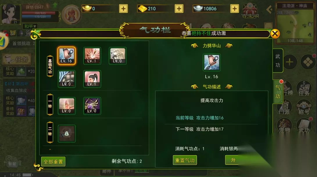 力劈华山:加攻击 满级是20点攻击力,太少了大佬可以不点,平民玩家可以点满。 摄魂一击:加命中 先点一级或者满级都可以,后面要点满的。 连环飞舞:普攻连击 不加,刀哥不用普攻打输出。 必杀一击:普攻必杀 不加,也是普攻加成所以不用加。 狂风万破:延长愤怒时间 加满 五转气功技能 一转技能四两千金:被攻击有概率反弹受到的百分百伤害。(反伤流派加满) 二转技能霸气破甲:攻击概率减少目标20%百分比防御。(打怪的时候破甲几率很高,加满) 三转技能真武绝击:提高武功致命一击概率百分比。(武功致命一击,加满) 四转技能一暗影绝杀:攻击概率附加10攻击力额外伤害。(加伤害的,可以点满) 四转技能二稳如泰山:提高防御力和生命力。 (这个是真的香,直接点满) 但是PK的话是五大职业中最拉跨的,这个看自己选择。