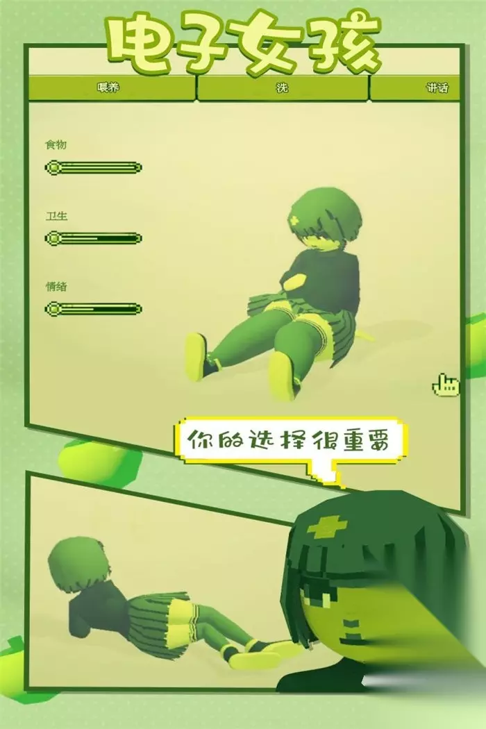 玩家在游戏中与女孩的相处方式非常丰富,比如给女孩喂食物,洗澡或者一起交谈等等。主要是以天数为主打造的育成方式,每一天都会发生各种不同的事情,大多数的事情都是随机产生的。玩家需要根据自己的理解作出选择,每一种选择都会影响着故事的不同发展走向。游戏中的画质选择护眼像素风格,可以更好的保护玩家眼睛。支持玩家360度自由旋转,任何角度都可以看到女孩子当下的情况。 》》》》》#电子女孩#《《《《《 3、《生娃模拟器》
