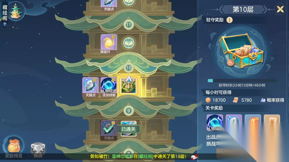 3、前期很重要的一个就是爬塔,这里叫藏经阁,爬这个塔会解锁人物经法技能上限和给天赋点,我看这个经法技能加不少的属性,啥都加。 爬塔还给天赋点,能让你多点天赋,我看天赋的提升还是很不错的,尽量多爬塔,前面爬不动可以试一下手动爬,能比挂机多爬不少关。 而且我看天赋里面可以切换流派,不过要45级,后面期待一下新的流派,看看到时候会有什么变化。器灵可以给你加技能buff和属性,最多可以带6个不过目前最多带2个,后面可以研究一下带哪些器灵比较好,有很多的组合肯定有强的和弱的。
