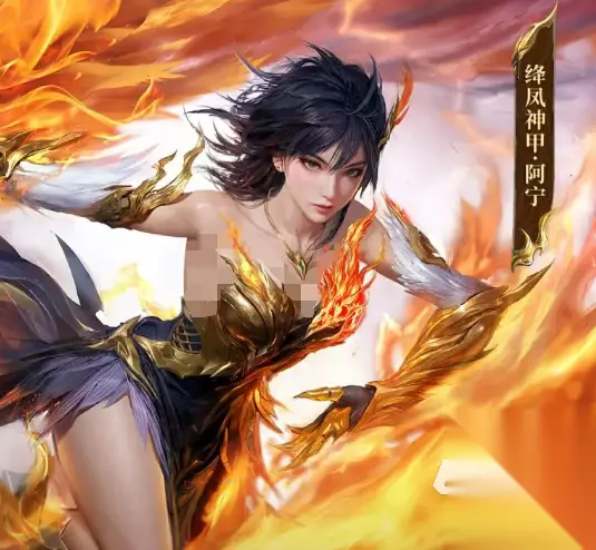 第三套外观「绛凤神甲·阿宁」,与「湛蓝玄铠」同属神话图腾系列,但将麒麟元素全面升级为凤凰意象。主色调为炽烈朱红,铠甲结构融入凤翼弧线与翎羽层叠纹理,肩甲与腰甲饰以鎏金凤首浮雕,裙甲边缘缀有流火状光效边框,在移动与技能释放时呈现渐变辉光,突出角色果敢凌厉的战斗风格。