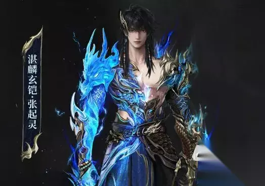 首套登场外观为「湛蓝玄铠·张起灵」,采用全动态特效设计,配备专属武器“黑金古刀”。角色身着以蓝色麒麟鳞片为灵感打造的全身铠甲,肩甲、护臂及胸甲均呈现精细浮雕质感;背部与手臂延伸出暗纹勾勒的黑色麒麟图腾,兼具神秘感与力量感。该外观在终结技触发时将激活专属镜头特写——蓝焰升腾、雷光迸裂,配合粒子拖尾与音效反馈,实现视觉与操作体验的双重强化。