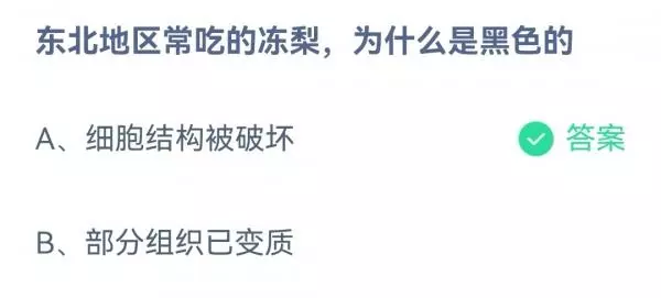 2022年12月9日蚂蚁庄园问题为东北地区常吃的冻梨为什么是黑色的,答案是细胞结构被破坏,原因是冰冻破坏细胞结构,低温下活性较高的多酚氧化酶催化梨中多酚类物质合成有色物质,同时低温破坏梨表皮营养成分,使其变黑。