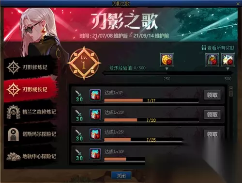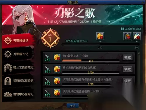 2、专属活动玩法 本次刃影享有专属的【刃影之歌】活动,一共分为两个环节。 一个环节玩法类似阿拉德探险记(战令),但是不需要购买,只需要完成积累的各类任务,提升修炼经验值,解锁奖励就行,很简单。 刃影修炼记到7级可获得神话随机礼盒,还有神话变更券等高价值道具。
