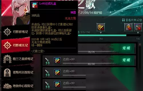 刃影成长记里以升级奖励为主,17级以及20级后每5级都将获得一份奖励。 其中包括对升级有利的“专属活动装备、一二觉特殊装备完成券”与最终大奖“毕业护石、红字书与神话变换石”等等。