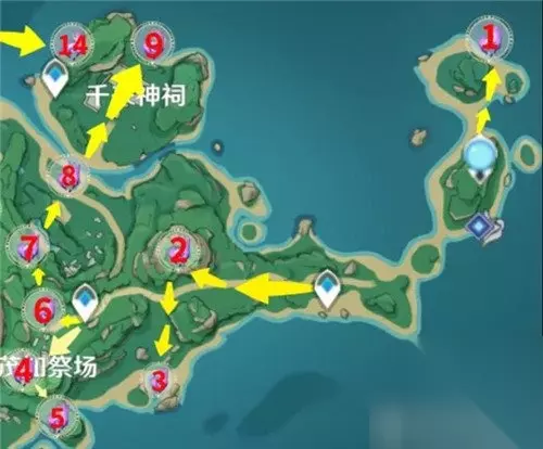 1.第一部分: 1号神瞳 引爆雷花解锁雷樱树之后使用雷极拿到神瞳 2号神瞳 在天上 3号神瞳 在水池中间 4号神瞳 在祭场的中心 5号神瞳 在石拱下 6号神瞳 露天神瞳附近有怪物守着 7号神瞳 露天神瞳,被丘丘人守着 8号神瞳 在一个石柱上, 9号神瞳 在神祠旁边使用传送门的时候会拿到