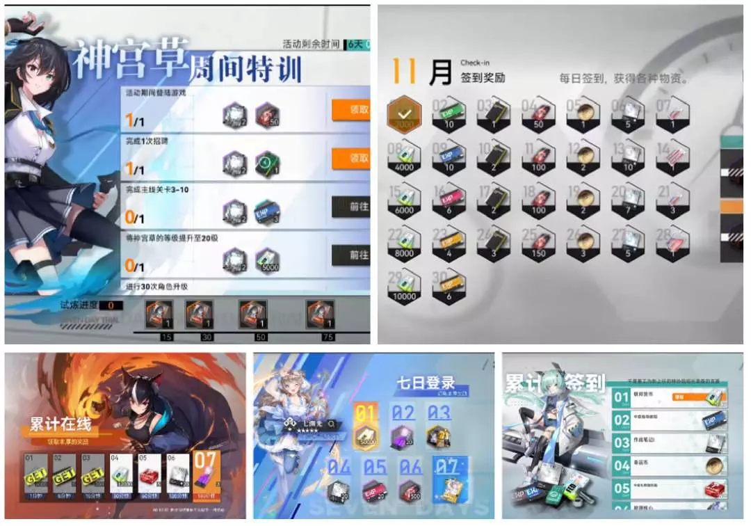 图片是目前现有的福利内容,按照累积天数和时间要求的阶段奖励实在是过多,而且普遍都是利用价值较低,影响抽奖内容和养成提升较少的内容表现,导致当前测试阶段的福利吸引性并不怎样。