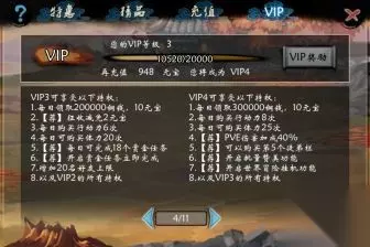 累计充值达到一定程度时可自动变成(升级)VIP。 VIP等级:累计充值达到一定金额时系统会自动提升VIP等级。 VIP待遇:不同等级的VIP所能体验的VIP功能不同,越高级的VIP可使用更多的VIP功能。 VIP奖励:凡是VIP用户,均可在VIP面板领取每日VIP奖励,越高级的VIP可领取的奖励越好。 VIP1可享受以下特权: 每日领取100000铜钱,5元宝 征收减免1元宝 每日可购买行动力2次 每日可购买体力4次 【荐】尊贵会员礼包 【荐】VIP藏宝袋开启特权 【荐】PVE伤害加成30% 增加10名好友上限 VIP2可享受以下特权: 每日领取150000铜钱,5元宝 每日购买行动力4次 每日可购买体力15次 【荐】可以购买第4个徒弟栏 【荐】试炼和冒险主角经验加成50% 【荐】强化2倍暴击概率增加10% 以及VIP1的所有特权 VIP3可享受以下特权: 每日领取200000铜钱,10元宝 征收减免2元宝 每日购买行动力6次 每日可购买体力20次 【荐】每日可完成18个赏金任务 【荐】开启赏金任务立即完成 增加20名好友上限 以及VIP2的所有特权 VIP4可享受以下特权: 每日领取300000铜钱,10元宝 每日购买行动力8次 每日可购买体力25次 【荐】PVE伤害加成40% 【荐】可以购买第5个徒弟栏 【荐】开启批量赞美功能 【荐】开启世界冒险挂机功能 以及VIP3的所有特权 VIP5可享受以下特权: 每日领取350000铜钱,20元宝 【荐】征收减免3元宝 每日购买行动力10次 每日可购买体力30次 【荐】试炼和冒险主角经验加成70% 【荐】开启擂台战斗跳过 VIP极品宝箱开启特权(暂未开放) 以及VIP4的所有特权 VIP6可享受以下特权: 每日领取400000铜钱,20元宝 每日购买行动力15次 每日可购买体力35次 【荐】PVE伤害加成50% 【荐】可以购买第6个徒弟栏 【荐】强化4倍暴击概率增加5% 以及VIP5的所有特权 VIP7可享受以下特权: 每日领取600000铜钱,20元宝 【荐】征收减免4元宝 每日购买行动力20次 每日可购买体力50次 【荐】VIP7五星回馈礼包 【荐】每日可完成24个赏金任务 以及VIP6的所有特权 VIP8可享受以下特权: 每日领取800000铜钱,30元宝 每日购买行动力30次 每日可购买体力60次 【荐】试炼和冒险主角经验加成100% 增加30名好友上限 以及VIP7的所有特权 VIP9可享受以下特权: 每日领取1000000铜钱,30元宝 征收减免5元宝 每日购买行动力35次 每日可购买体力70次 【荐】擂台免CD 以及VIP8的所有特权 VIP10可享受以下特权: 每日领取1200000铜钱,30元宝 每日购买行动力40次 每日可购买体力80次 【荐】上线全服广播 以及VIP9的所有特权