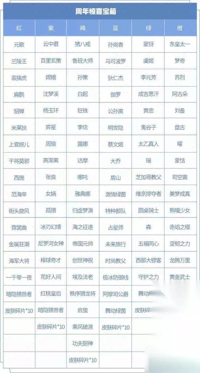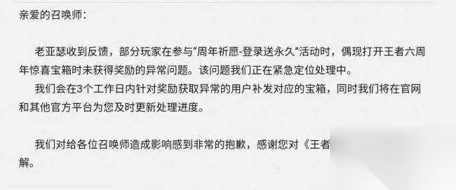Ti3 一般推荐的是,缺什么就选什么,玩什么就选什么,如果没有选择的话,只选贵的不选对的。建议换褐色的,其次是橙色、绿色和蓝色,具体换哪个还是得看自己实际英雄和皮肤情况,如果想碰运气抽史诗,那么换褐色的就足够了。Ti3 四、补发宝箱奖励为空Ti3 最后“周年祈愿——登录送永久英雄皮肤”出现开启惊喜宝箱奖励为空异常情况已修复,同时官方表示会在接下来的三天对出现异常情况的玩家进行补发宝箱处理, 大家还需耐心等待!Ti3