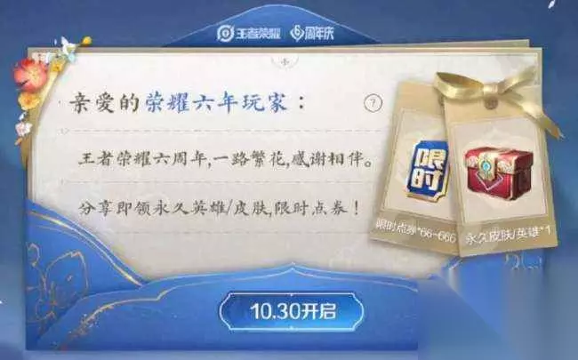 Ti3 一、六周年惊喜宝箱介绍Ti3 活动时间:10月30日-10月31日Ti3 活动入口:活动中心-周年庆-【周年祈愿/登录送永久】Ti3 活动规则:期间登录并分享活动,即可领取王者六周年惊喜宝箱*1,打开宝箱可自由选择颜色(红/紫/褐/蓝/绿/橙)均有几率开出永久英雄、皮肤。Ti3