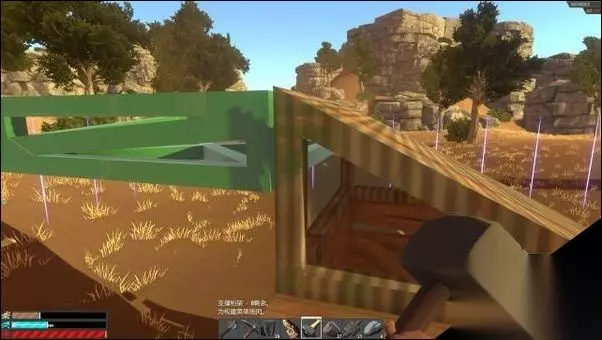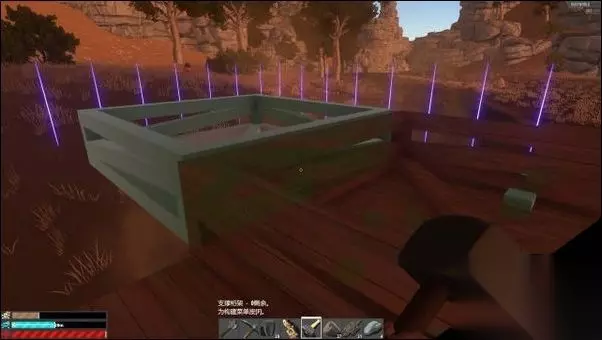 如图所示: 看到这紫色的光柱么,这个光柱把游戏空间分成一个一个的方格,方格大小固定不变。图腾范围就是指你图腾所在的格子。如图我的图腾在分割线紫色的光柱左边门在右边这样这个门就不受图腾保护开门的权限是门建造者。任何人用锤子的消除功能都能把门拆掉。【只有建筑所在方格内有图腾建筑才不会被别人用锤子就拆除】当然你家建造占地几个格子就要用几个图腾保护起来。 2.基础建造部件解读