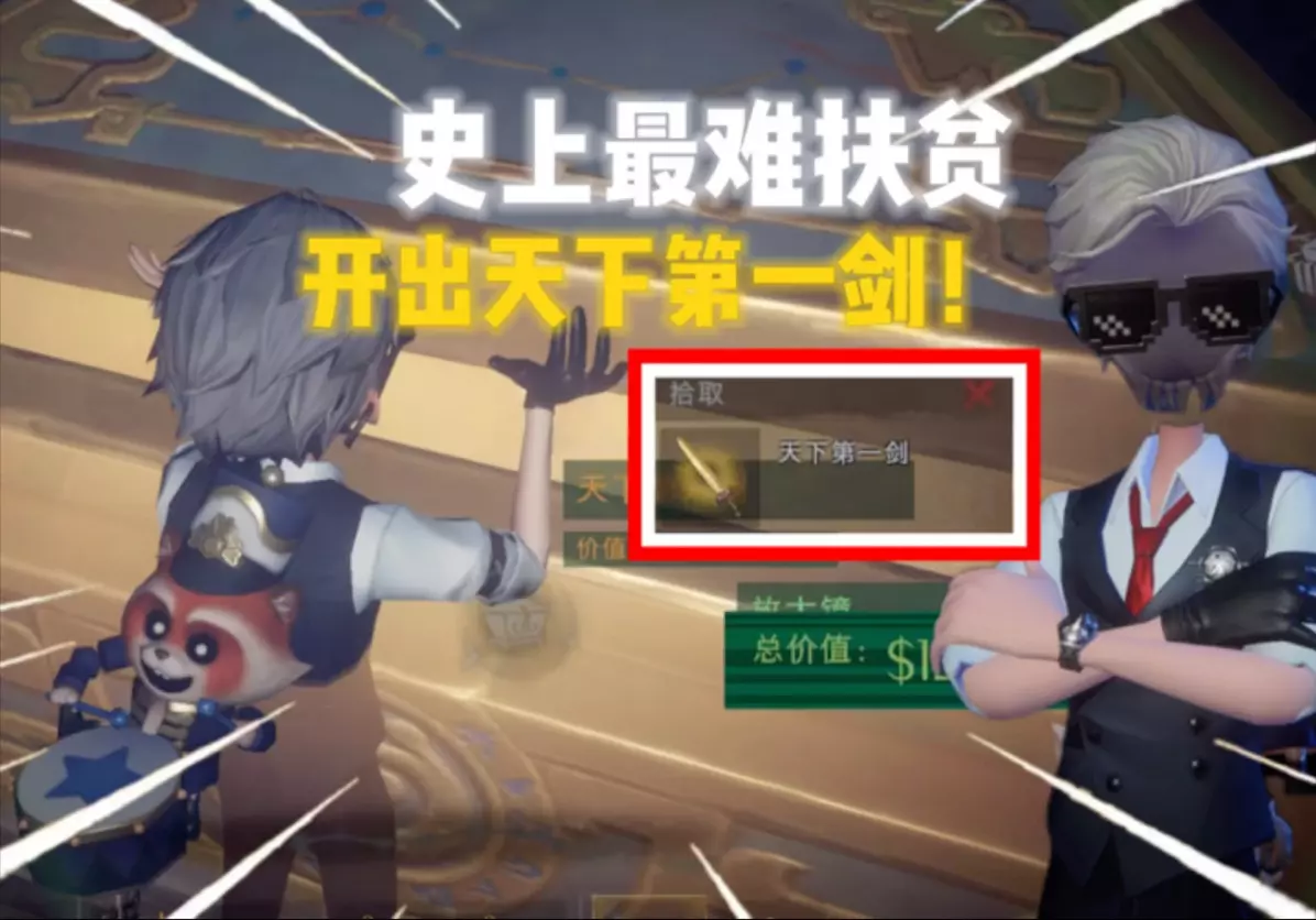 这是一则游戏娱乐帖,展示了游戏内的赠送功能,玩家可将回收物天下第一剑赠送给其他游戏好友,同时还展示了背包里的泰阿剑、法棍等回收物以及各类道具。