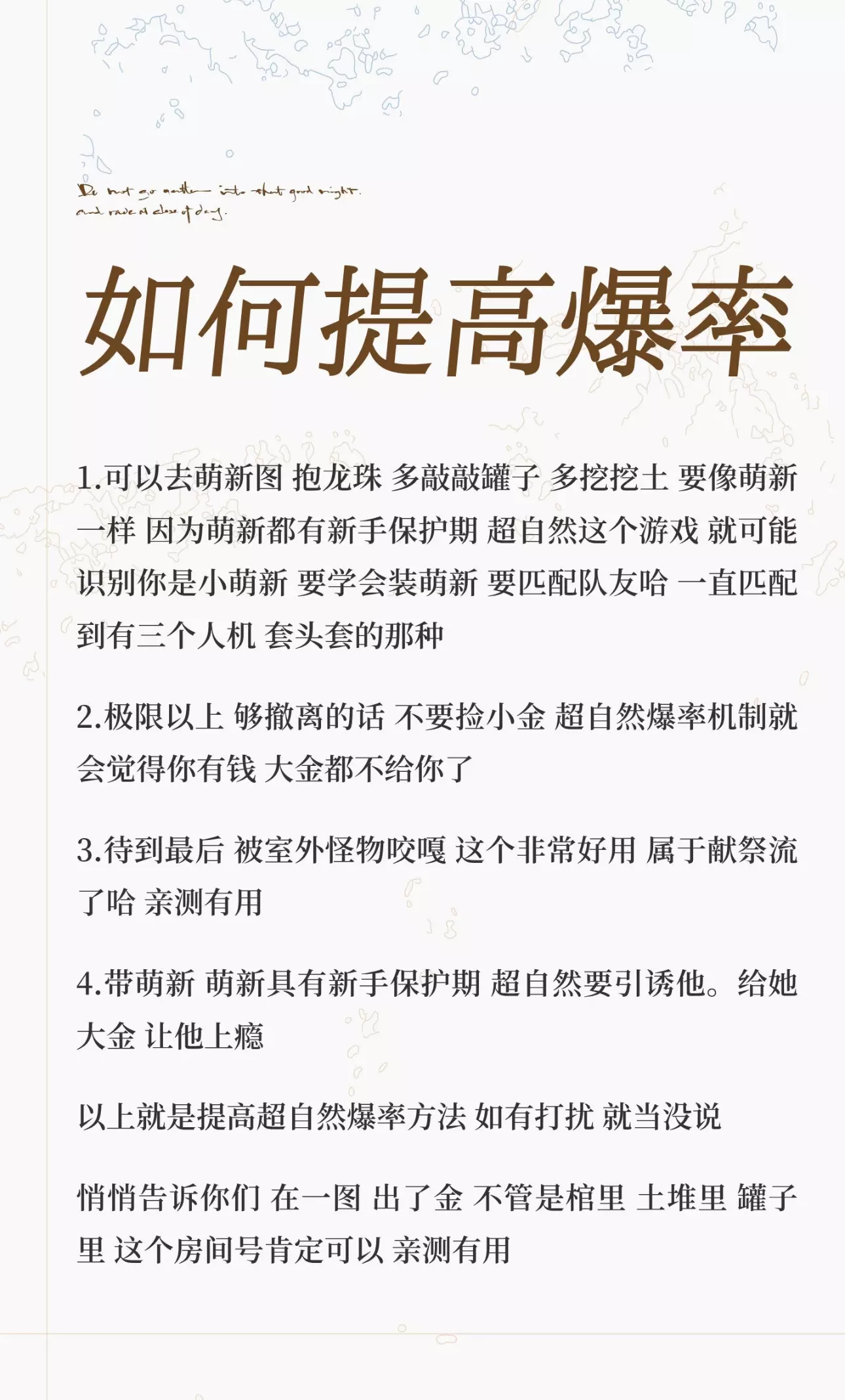 💀【玩法核心:3分钟看懂规则】💀 这是一个4v1的非对称对抗玩法,你将随机扮演员工或怪物,在青铜巨门背后的神秘世界展开生死追逐! ▶ 员工目标: · 寻找5个被藤蔓缠绕的棺椁,从中获取钥匙和回收物 · 多人协作清理藤蔓效率更高 · 开启5个棺椁后,携带回收物冲向青铜巨门逃生 ▶ 怪物目标: · 通过足迹追踪员工 · 击倒员工并关押至【假门】 · 阻止员工逃脱,夺取他们的回收物 ▶ 胜负条件: · ✅员工胜:≥3人逃脱 · 🤝平局:2人逃脱 · ❌怪物胜:≤1人逃脱 🎯【员工进阶技巧:从萌新到逃生大师】🎯 1. 开棺策略 - 分工合作!建议2人一组,一队开棺一队望风,遇到怪物立刻发信号 2. 逃生神技 - 灵活运用场景交互: · 翻窗、推倒木板阻挡怪物 · 关键时刻藏入柜子躲避追击 · 利用地形绕晕怪物,争取开棺时间 3. 团队救援 - 队友被关进假门后,立即组织营救!拖延时间会导致永久减员 👹【怪物实战心得:成为最强追猎者】👹 · 善用专属技能,每个怪物都有独特追踪能力 · 守株待兔:在棺椁和假门附近设伏,效率远超盲目追击 · 重点击破:优先 targeting 落单员工,瓦解团队协作 💎【版本更新亮点】💎 · S2赛季开启,新增「惊魂农场」主题地图 · 敦煌联动活动进行中,限定家具、工具皮肤免费领 · 怪物幻象常驻玩法,随机变身乐趣多多 👉赶紧约上你的固玩队友,一起来青铜巨门背后挑战极限吧!😉#超自然行动组 #开学后全在玩超自然 #超自然惊魂逃生太爽啦