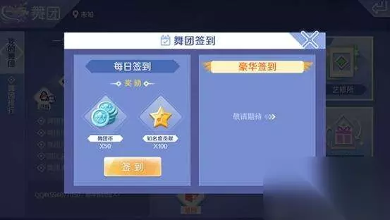 图2:舞团签到 每日舞团签到非常好理解,每天玩家登陆游戏后,可以到点开舞团参与签到。通过签到就可以直接获得舞团币,并贡献舞团知名度,每日签到玩家可以获得50舞团币的奖励。同时舞团还拥有豪华舞团签到,不过目前暂未开放。