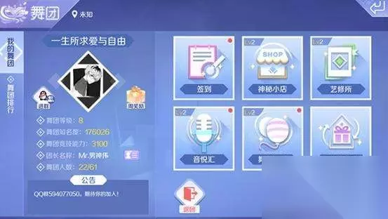 QQ炫舞手游舞团中包含了丰富的玩法,玩家每日都可以在舞团中选择参与,通过这些玩法可以提高舞团间的玩家互动,提升自己舞团的知名度,同时玩家自己也可以获得金币、舞团币的奖励。舞团币可以直接用来在舞团中的神秘商店里购买道具,所以每日参与舞团玩法可是非常重要的!