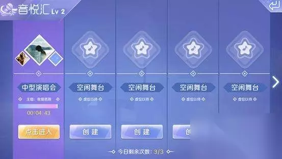 图3:音悦汇 音悦汇中玩家可以创建演唱会,舞台数量根据舞团等级而定,演唱会创建分为小型演唱会、中型演唱会、大型演唱会3种,分别需要玩家使用金币、点券、钻石进行开启,开启演唱会需要等待一定的时间,演唱会结束后玩家就可以领取到奖励,其中奖励就包含了舞团币。每天玩家最多可以参与3次音悦汇,是每日稳定获得舞团币的重要途径。