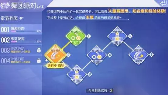 图4:舞团派对 舞团派对中玩家可以和舞团的其他小伙伴一起完成歌曲挑战,和音悦汇一样玩家每日有3次挑战机会,每次挑战都可以获得舞团币、舞团知名度、经验值的奖励。另外玩家在舞团派对中完成整个歌曲章节,还可以领取到丰厚的章节通关奖励。舞团派对不需要消耗任何资源,推荐玩家每日到舞团参与3次歌曲挑战,从而快速积累舞团币。