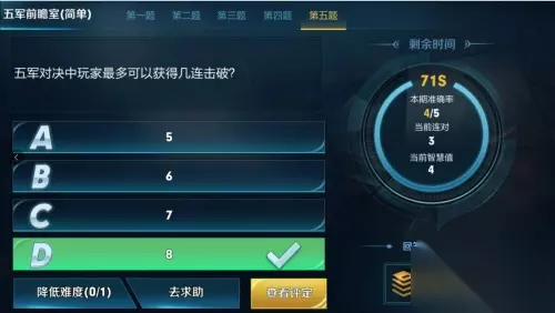 王者荣耀五军对决中玩家最多可以获得几连突破,那么一起来看看吧。 五军对决中玩家最多可以获得几连突破: 正确答案:D 8