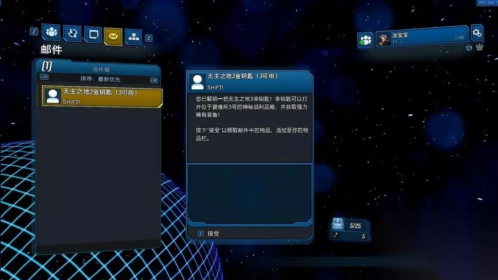 图二: 提交成功 然后,在菜单的第四个邮件选项(位于 SHIFT 右侧)中,点击已收到的邮件并选择接受,金钥匙就会进入你的物品栏。