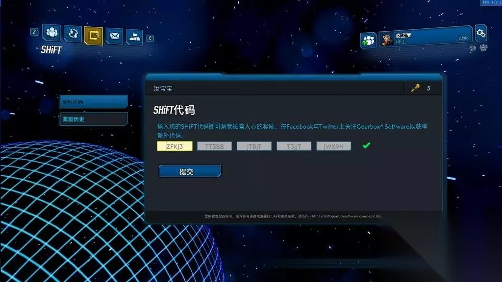 黄金宝箱如图所示,首先带来福利:以下是我收集的兑换代码。 1.ZFKJ3-TT3BB-JTBJT-T3JJT-JWX9H(此代码可获取三把钥匙) 2.9XCBT-WBXFR-5TRWJ-JJJ33-TX53Z(此代码也可获取三把钥匙) 3.ZRWBJ-ST6XR-CBFKT-JT3J3-FRXJ5 4.Z65B3-JCXX6-5JXW3-3B33J-9SWT6 5.HXKBT-XJ6FR-WBRKJ-J3TTB-RSBHR 6.ZFKJ3-TT6FF-KTFKT-T3JJT-JWX36 兑换方法如下:按下 ESC 键打开菜单,在社交菜单中选择 SHIFT(中间的图标)。注意,如果你没有 SHIFT 账号,需要创建一个(只需输入邮箱、密码并确认年满31岁)。已有账号的玩家可以直接登录,界面如图一所示。将兑换代码复制并粘贴到框中,然后点击提交。