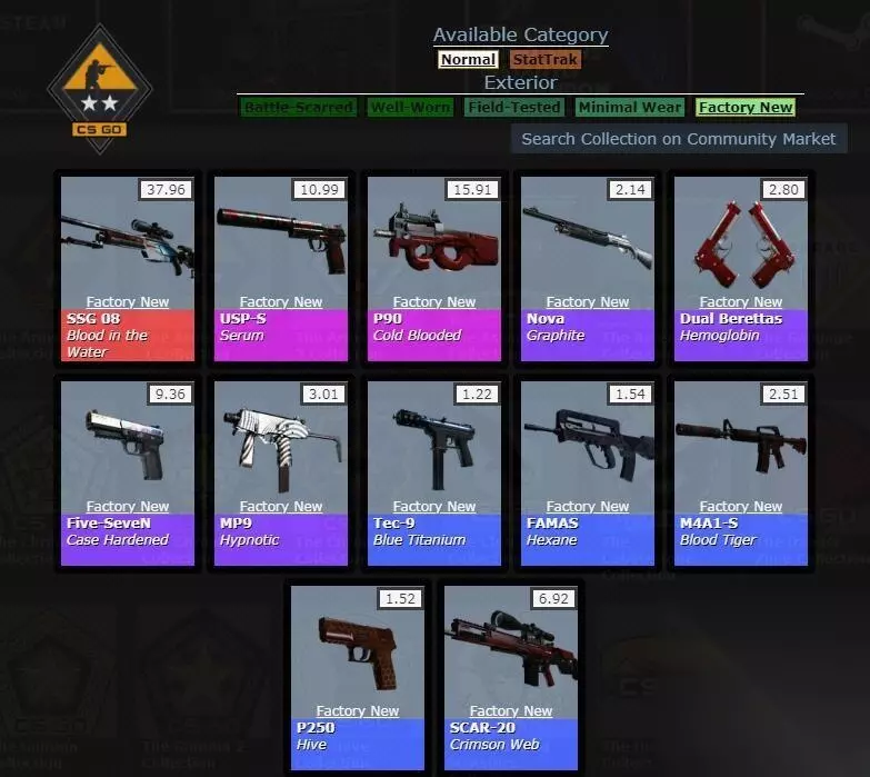 此款箱子共有12款饰品,其中5款军规级,分别是Tec-9 | 蓝钛、M4A1 消音型 | 血虎、法玛斯 | 蓝巢、P250 | 红巢以及SCAR-20 | 深红之网。紫色受限共有4款,分别是FN57 | 表面淬火、MP9 | 蛊惑之色、新星 | 石墨黑以及双持贝瑞塔 | 血红蛋白。保密级别有2款,它是P90 | 冷血杀手和USP 消音版 | 血清。最后就是大佬级别的隐秘款,那就是SSG 08 | 水中之血。 二、价格走势