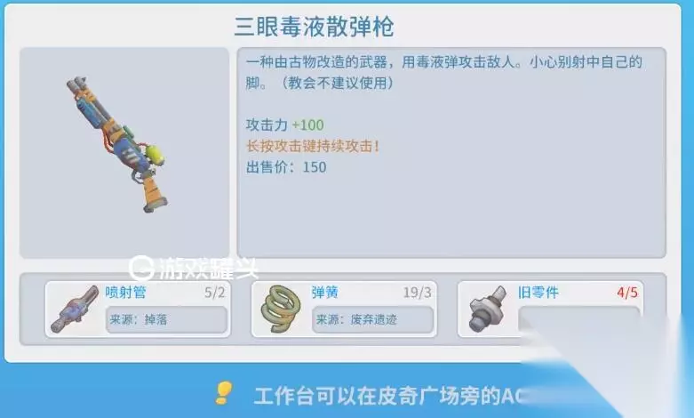 我们首先来看一下制作散弹枪需要的物品,喷射管,弹簧,旧零件。 这三种物品里,喷射管最难获得,我们需要在下水道遗迹去打怪,将最后BOOS杀死就会掉落喷射管,弹簧,在下水道遗迹也能获得,平时挖矿也能挖到,旧零件也是挖矿能够挖到的。 我们集齐这些零件之后就可以利用自己的工作台制作就OK了。 波西亚时光散弹枪制单三眼毒液子弹怎么制作