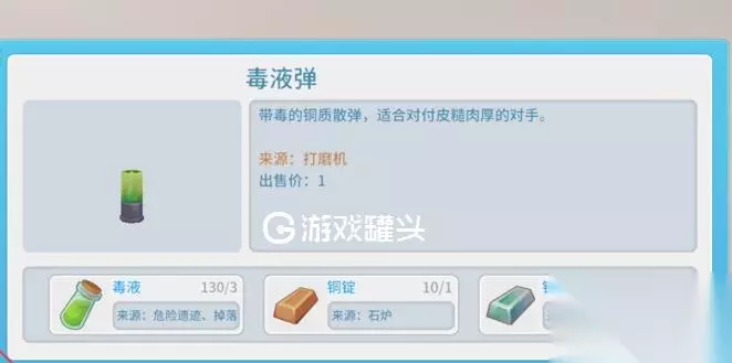 毒液弹在游戏里是一个消耗品,打一颗少一颗,制作还比较废材料。制作毒液弹需要三种物品,毒液、铜锭、铅锭。 铜锭铅锭:我们去挖对应矿石然后熔炉提炼就可以了。