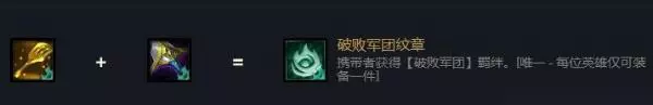 由于s5赛季新加入的黑暗装备机制,小件是否有黑暗装备会导致合成的结果不同。这里破败军团的转职要求装备的两个小件里至少有一个为黑暗装备,不能两个都是普通装备(也叫作白装备),否则合成的结果将变为神盾战士转职。 也就是说铲子和大剑的合成组合情况有以下4种: 铲子+大剑=神盾战士(两件白装备) 黑铲子+大剑=破败转 铲子+黑大剑=破败转 黑铲子+黑大剑=破败转