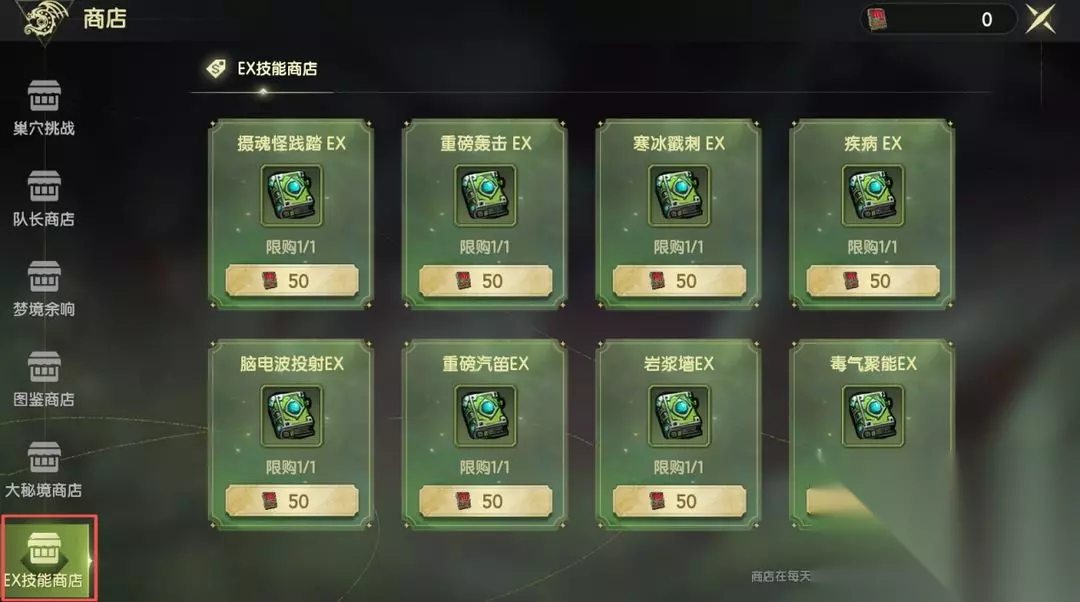 3.左侧列表下滑至底部,点击 【EX技能商店】使用 【技能书】即可直接兑换!