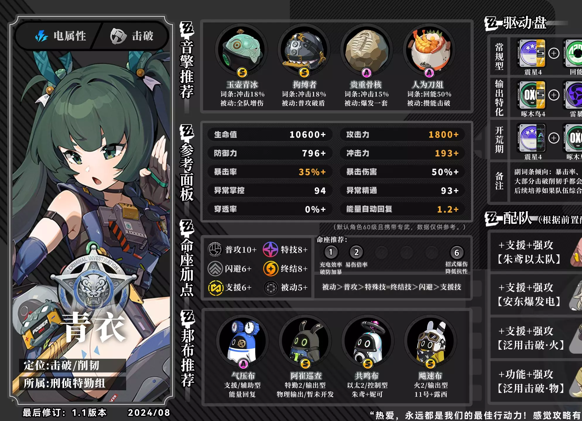 这是手游《绝区零》青衣的0~6命保姆级攻略,青衣迎来加强,易伤倍率升至80%,失衡速率提升,2命也得到加强,操作上普攻二段闪避后可接连打,冲刺攻击改为地面受击,战斗操作更丝滑省时间,还包含技能机制、实战手法等内容。