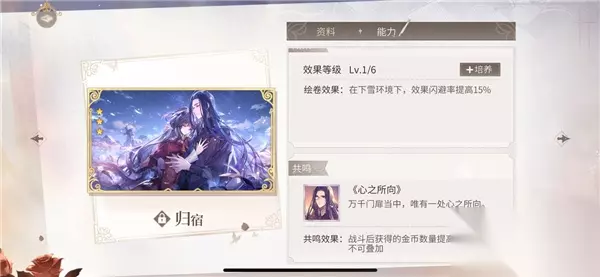 效果等级Lv.1/6 绘卷效果:在下雪环境下,效果闪避率提高15% 共鸣-《心之所向》 万千门扉当中,唯有一处心之所向。 共鸣效果:战斗后获得的金币数量提高5%,效果不可叠加