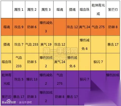 二、终极铸元选择 三、脸帝的选择 四、如果你只有噬血珠 五、一般人的选择 六、最后的最后,本文的意义 一、认识法宝铸元 (一)什么是法宝铸元?——简单而又不简单。 1.简单之处: 我们都知道,法宝铸元分为元气等级、元气属性、共鸣三个内容。 通过元气,升级元气等级,获得更多的元气属性。 通过收集并提升拥有共鸣属性的其他法宝,提升共鸣等级,获得共鸣属性。 2.不简单之处: 先看图:这是一张所有法宝元气属性及与其他法宝关系图(被切成了两块儿) 图1-1:所有法宝元气属性及与其他法宝关系图 【山大王吐槽:明明是俩图?!?!】 从图中,我们可以知道: (1)看元气属性,可知法宝有优劣之分 如图1-1所示,诛仙剑、噬魂攻击9;摄魂羽翅攻击7。显然,诛仙剑和噬魂一个档次,并且比摄魂羽翅高一个档次。 因而同理,我将所有法宝分为绿、蓝、紫、橙、金五个档次。 从属性成长看(图中未列出)—— 紫色的大悲金轮,1级-2级,全精通10-19,成长为9 蓝色的伤心花,1级-2级,全精通7-15,成长为8 所以,显然选择法宝,我们应优先选择档次高的。 (另外:还是以大悲金轮为例,并不是1-100级,全精通每级的成长都是9; 41级的成长较40级有再次提升,40以前未留意,估计是每10级或20级提升一次) (2)看共鸣属性,可知法宝相同共鸣属性的值都是一致的 如金色的诛仙剑,与羽翅 攻击是12 而蓝色的阴阳镜,与摄魂 攻击也是12 这表明共鸣属性值是一致的,我们只需要考虑元气属性以及搭配就行了。 (二)法宝铸元的对象是什么?——自己收集到的所有法宝。 这个问题很重要。因为想必99%的朋友,都是自己带的什么法宝,就铸元那个法宝。 如果没有共鸣系统,只铸元一个法宝,这当然没有错。 而正因为有了共鸣的存在,我们就必须考虑升级一些法宝。哪些法宝能相互激活更多的共鸣属性,就成为了我们的选择。 所以,在自己确定铸元的某组法宝里,如果恰好有正在使用的主法宝,那么先只铸元这个,没有错。但也不能一铸到底。打个比方:当它50级的时候,升51所需的元气用来升级这组法宝里,其他的1级法宝,获得的收益更大。 (三)以多少个法宝来构成一个组合?——我选择5个。 原因:金色、橙色以及部分紫色法宝,都有4个“共鸣缘”,为获得共鸣属性最大化,应选择5个法宝来构成组合。 (四)怎样判别法宝组合的优劣——看元气属性、共鸣属性。 首先,看元气属性的个数,因为元气属性的提升比共鸣多。 在元气属性相同的情况下,看共鸣属性的个数。 再次相同的情况下,看元气属性、共鸣属性的具体属性。根据自己的需求来选择。