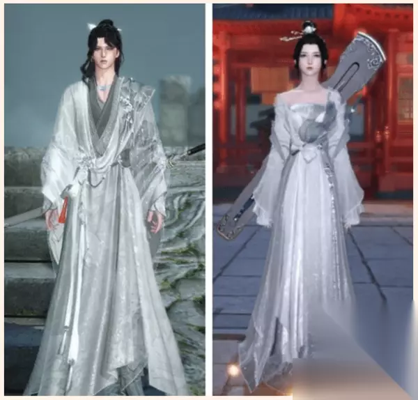 四、前往杭州(941,659)与相思门接引人对话回到门派,在桃花 坞(1261,616)与执剑人对话领取时装。 外型展现—— 主体使用了银白银灰的配色,带细闪的灰色沙布裁切而出的花式使整体的风格非常温柔甘冽。 女角色纯色的发簪和男角色微卷的长发显得总体非常温柔,师门寓意也挺好,很适合作为情侣装。