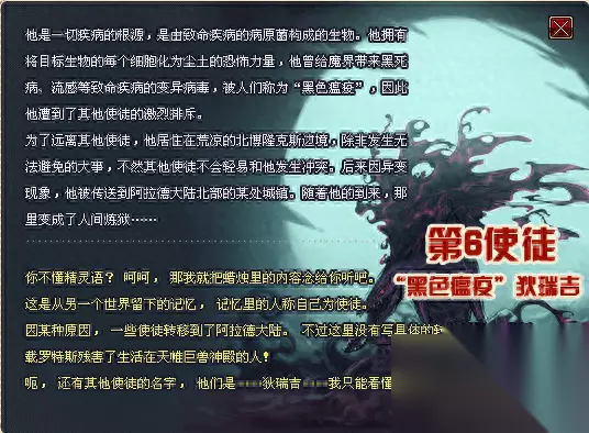 居住地:他的故乡→魔界北博隆克斯边境→阿拉德大陆(诺斯玛尔,痛苦之村列瑟芬) 皮特,魔震,罗刹的老大 一切疾病的根源,是由致命疾病的病原菌构成的生物。 狄瑞吉拥有能够把目标生物的每个细胞都变为尘埃的的恐怖力量,他曾给魔界带来黑死病、流感等致命疾病的变异病毒,被人们称为“黑色瘟疫”,因此遭到了其他使徒的激烈排斥。 他从出生的第一天便成为了这样不可更改的存在。于是为了不伤及他人,他居住在荒凉的北博隆克斯边境,除非发生无可避免的大事,其他使徒都会回避与之争执。 他是转移事件中第三个受害者,在被赫尔德转移的途中从异次元裂缝中掉落了部分身体在诺伊佩拉,使得诺伊佩拉变成了一片废土,在艾丽丝的唆使下使得人类和暗精灵的关系紧张,这之后狄瑞吉被赫尔德先后转移到了诺斯玛尔和列瑟芬。现在那些地方都已经化为了人间地狱。 当众冒险家和阿甘左得知了狄瑞吉的所在地后,被艾丽丝赐予了魔法“赫尔德的庇护”得以无视狄瑞吉的瘟疫,并前往痛苦之村列瑟芬与其激战。最终狄瑞吉被众冒险家推入了赫尔德打开的时空裂缝而被吞噬殆尽。 狄瑞吉:“异次元裂缝……??!!哈哈,你太有趣了!因为我是不死之身,所以你想把我推进时空裂缝里,让时空的压力把我的身体压碎,是吗? 那我死之后呢?是不是你这个小菜鸟就能一跃成为英雄了? 哼…她还真是厉害,自己不用出面,竟能把你们这些小菜鸟培养的这么出色…不过…你以为这计划能顺利完成吗?别忘了,可怜的生命体,这里虽然是你们的世界,但是在魔界可是我们使徒的天下!”