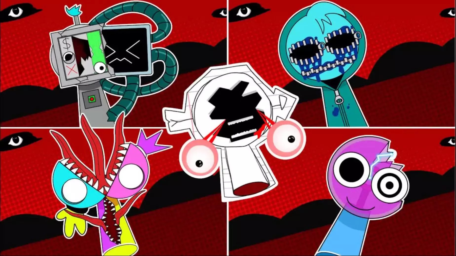 这是创作者分享的节奏盒子机器人创作灵感,展示了不同形态的节奏盒子机器人,正常形态的机器人可爱讨喜,异变后的黑暗形态风格惊悚怪异。