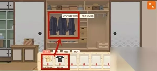 二、换衣步骤 1、在客厅中,点击最右侧的那个门,具体位置如下图所示。胡桃日记怎么更换衣服 换装方法分享 2、打开衣柜,将底栏的衣服拖上去,就能放入衣柜。注意左边是放衣服的,右边是放裤子的,如果提示有点偏,就是放错位置了。胡桃日记怎么更换衣服 换装方法分享 3、等待第二天的到来,胡桃就会换上衣柜里的衣服了。这里简单概括一下换衣服的机制,如果衣柜里面没有衣服,胡桃就不会换衣服;如果只有一件衣服,第二天必定换这件衣服;如果有多件衣服,会随机换一件衣服。胡桃日记怎么更换衣服 换装方法分享