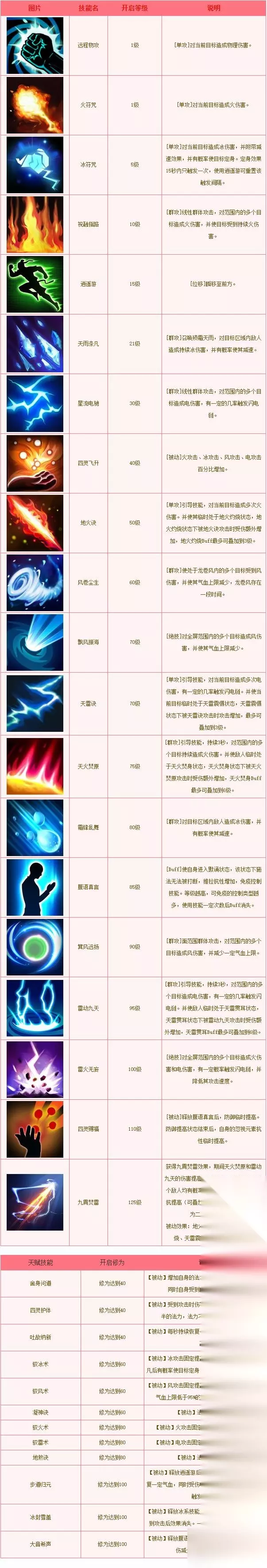 逍遥游满无可争议 躲避追踪和逃跑技能,和对方拉开距离施展远程攻击必备的。四灵护体后面点满吧至少30以上。对于皮本来就脆弱的方士是很重要的技能。腹语真言尽量点吧,PK和群战的时候必备的好技能,必要时候可以救自己一命。驭火术雷 被动技能尽量点高一些,可以提供对应技能的攻击值,加大输出。 舍身问道和四灵护体一起点。此技能点到20级以后就不会有自身伤害了。和四灵护体配合用效果很明显。火符咒等单体攻击技能必须点高。是攻击技能的基础祝融指路尽量点吧,也是前置技能,必备的地火决必须点满。方士攻击必需技能之一。天雷绝必需点满,后期效果比地火诀更明显, 天雨涤凡尽量点满。在群战和副本输出时候,效果都很明显,还可以降低对方移动速度。镜寒刺骨适当点,前置技能。霜风乱舞适当点,有减速效果也有一定的输出。雷动九天等群攻技能适当的点一些,在活动和任务中有一些好处。
