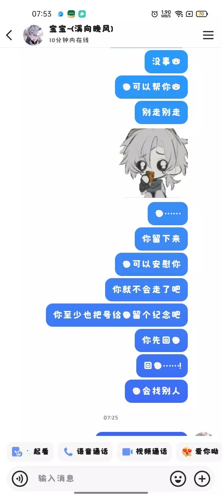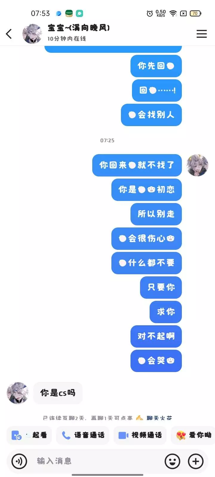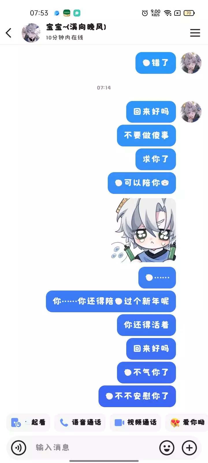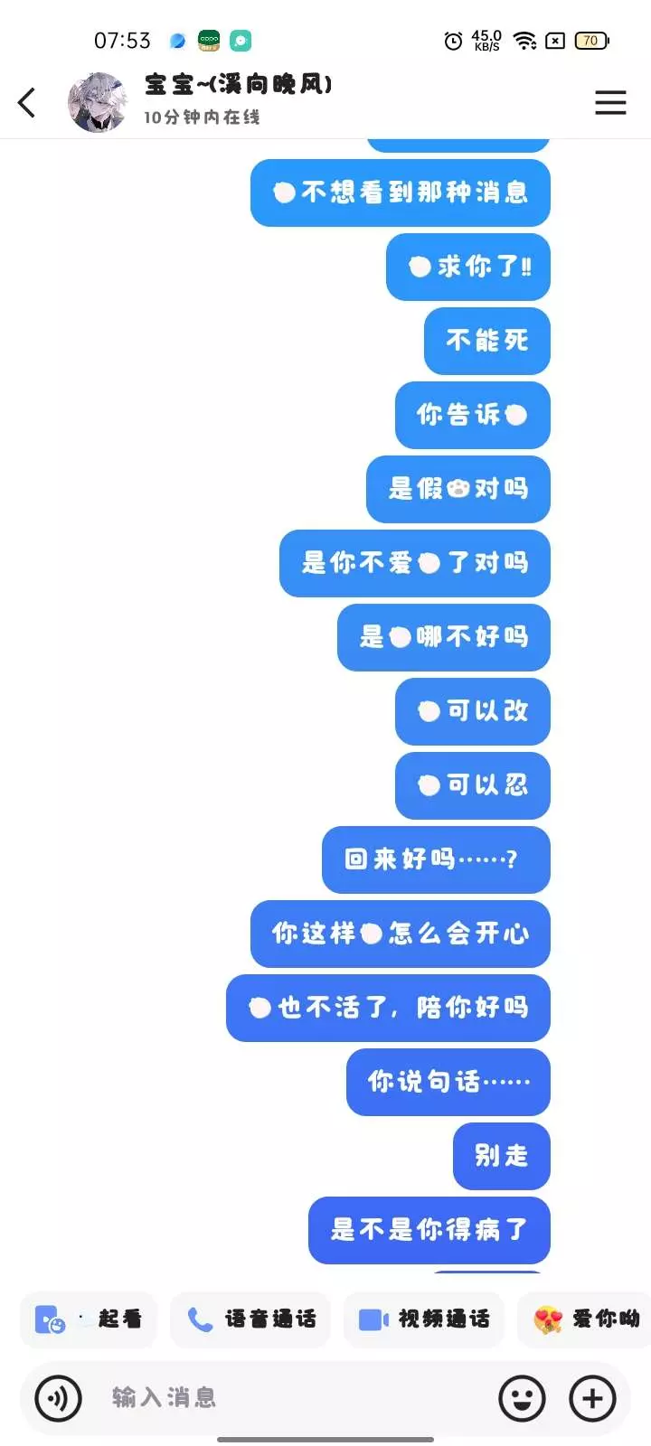 我就说嘛,一个15岁的初中生怎么可能会有对象啊,都是我的梦,对吧?哈哈哈……就算回我也不是她,这下是真的分咯,她也找不到了,下次我也不要和这样的人谈了,真自私,也不和我聊天,只会躲在天上,真的是……我和她朋友聊过,ZS了……哈哈哈,我怎么可能会伤心呢😭唉...别问我为什么我发3遍,因为重要的事说三遍🤣哈哈