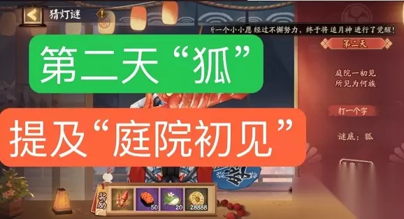 1、谜面:庭院—初见,所见为何族(打一个字),谜底:狐 2、活动期间,每天0点会刷新一条灯谜,大人回答正确答案,即可获得「烟火筒」,体力、樱饼及金币等奖励。 3、答题没有次数限制,答错依然可以继续回答,大人还可通过页面「求助」按钮,在世界频道寻求帮助,询问正确答案。 以上是小编为各位带来阴阳师灯谜庭院一初见所见为何族答案一览的全部内容,更多精彩游戏资讯,请持续关注233乐园。