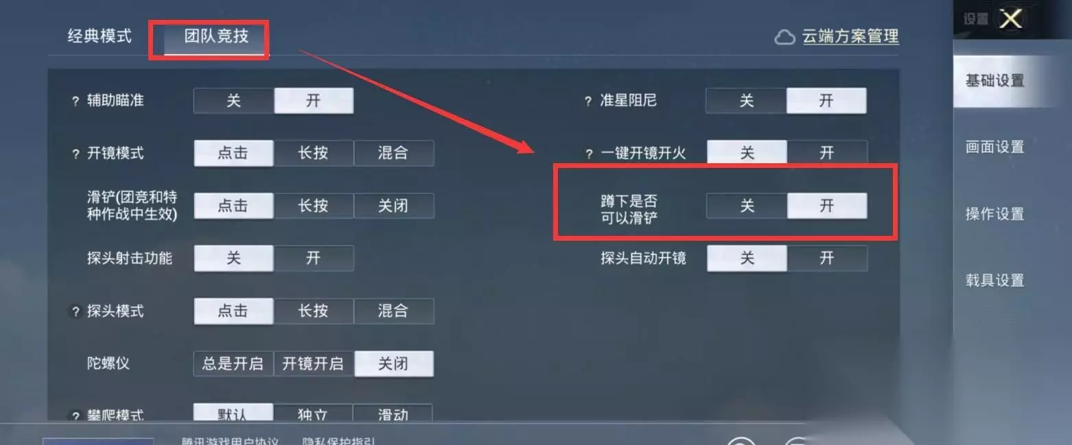 3、最后选择【团队竞技】,找到并打开【蹲下是否可以滑铲】。