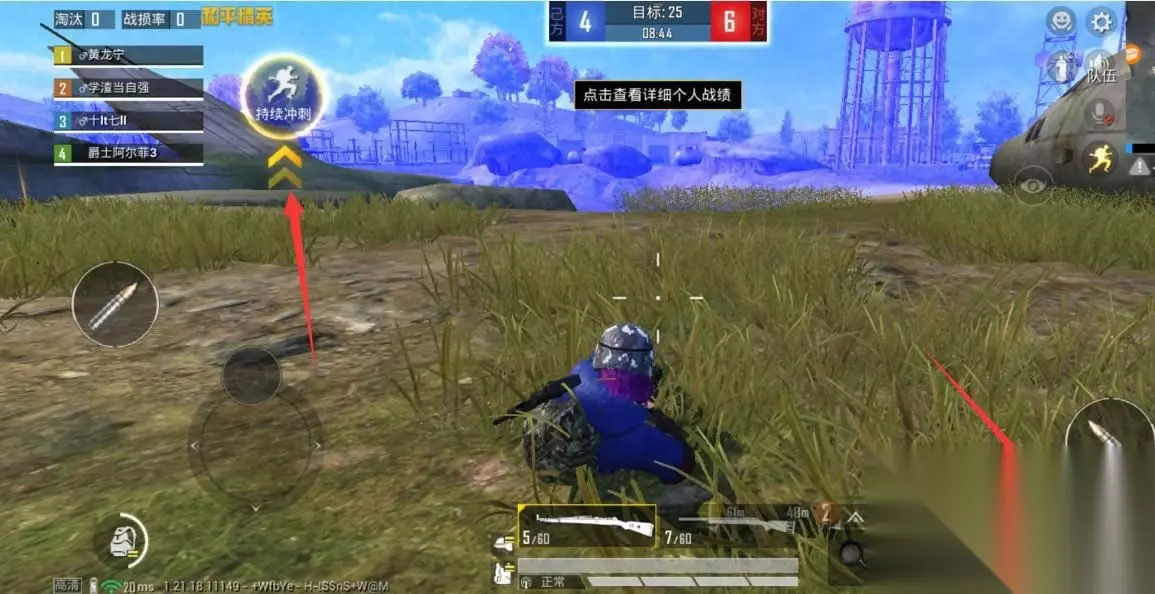 7、进入游戏后,左手按住轮盘【不断冲刺】,右手点击【下蹲】按键,即可飞铲。