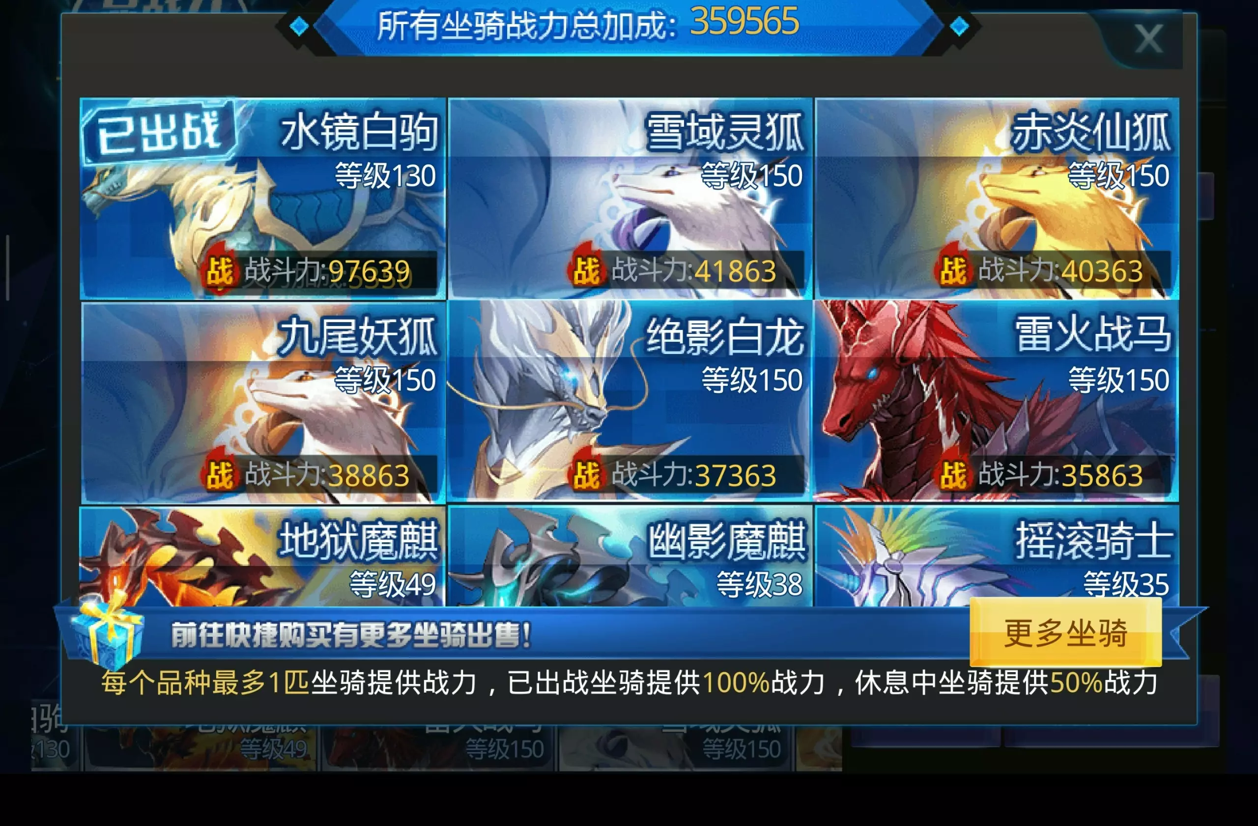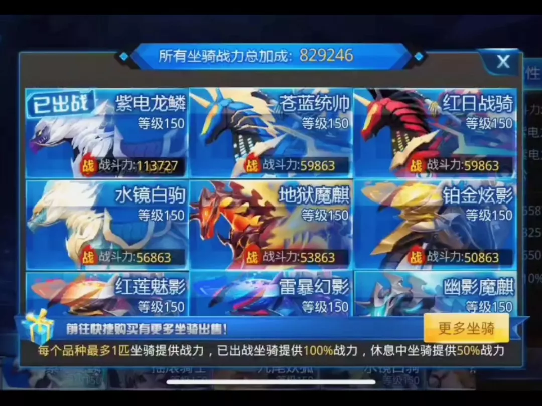 这是《天天炫斗》的玩家分享,展示了地狱魔麒、水镜白驹等多款坐骑,玩家将部分坐骑升至满级,还通过坐骑经验丹升级坐骑提升战力,完成后表示又能少打一个副本。