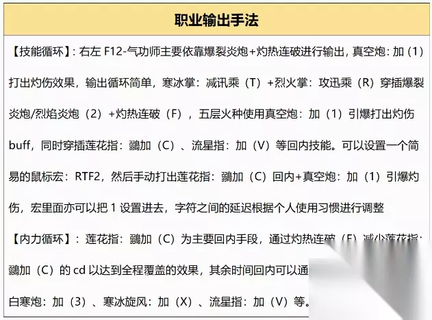 剑灵气宗输出手法及加点攻略 输出手法介绍: 技能循环:右左F12-气功师主要依靠爆裂炎炮+灼热连破进行输出 真空炮:加(1)打出灼伤效果,输出循环简单 寒冰掌:减讯乘(T〉+烈火掌:攻迅乘(R))穿插爆裂炎炮/烈焰炎炮(2)+灼热连破(F) 五层火种使用真空炮:加(1)引爆打出灼伤buff,同时穿插莲花指:妇加(C)、流星指:加(V)等回内技能。 可以设置一个简易的鼠标宏:RTF2,然后手动打出莲花指:勇加(C)回内+真空炮:加(1)引爆灼伤,宏里面亦可以把1设置进去,字符之间的延迟根据个人使用习惯进行调整【内力循环】 莲花指:黜加(C)为主要回内手段,通过灼热连破(F)减少莲花指:锦加(C)的cd以达到全程覆盖的效果,其余时间回内可以通过真空炮:加(1)、冰白寒炮:加(3)、寒冰旋风:加(×)、流显指:加(V)等。