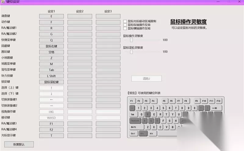 键鼠操作如下: 移动按键-ASDW 视觉镜头-IJKL 菜单方向选择-小键盘方向键 调查-E 动作-F RA/魔法键1-R RA/魔法键2-G 快捷菜单键-Q 回避键-鼠标右键 攻击-鼠标左键 小地图-Z 圆环键-空格 地图菜单-M 背包菜单-Tab 协力技-左Shift 锁定敌人-鼠标滚轮按下 RA/魔法键3-F1 RA/魔法键4-F2 光标显示-T