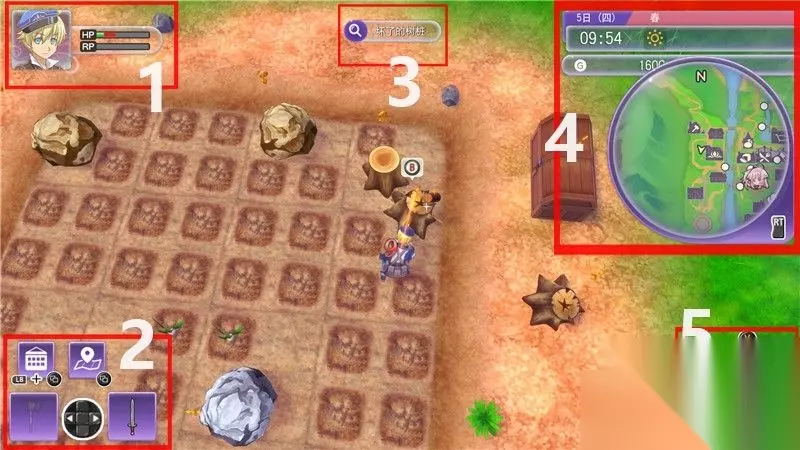 游戏界面解析 1. 角色状态(生命值,RP值,异常状态) 2. 武器/工具菜单 3. 当前(附近)调查对象 4. 日期/天气/小地图 5. 快捷武器切换菜单(可在功能菜单中进行配置)