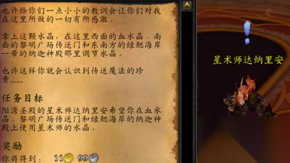 任务攻略: 阳湾圣殿的星术师达纳里安希望你在血水晶、黎明广场传送门和绿鳃海岸的纳迦神殿上使用星术师的水晶。 这个任务需要玩家携带任务道具前往指定地点使用,三个接收读数的位置坐标分别是: 血水晶(房子里):42,36 传送门:48,44 纳迦神殿(海水中间):62 62